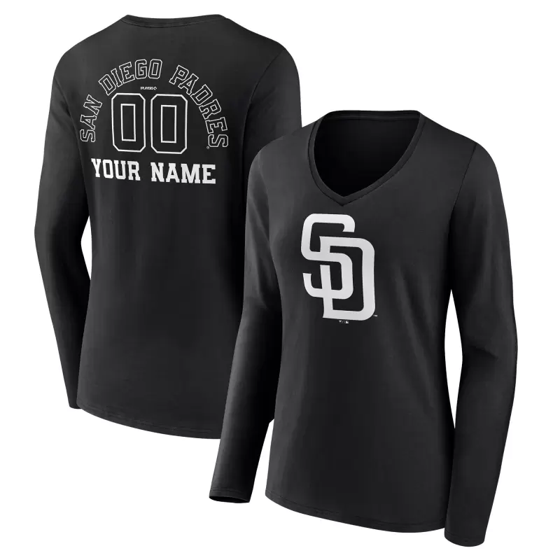 Women’s San Diego Padres Black Monochrome Personalized Name & Number Long Sleeve V-Neck T-Shirt