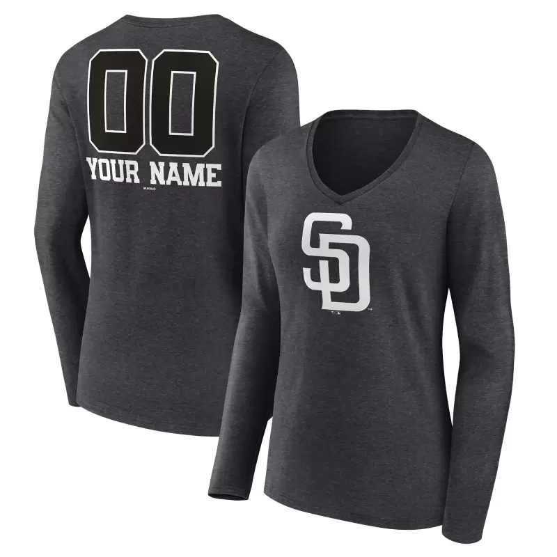 Women’s San Diego Padres Charcoal Personalized Monochrome Name & Number Long Sleeve V-Neck T-Shirt