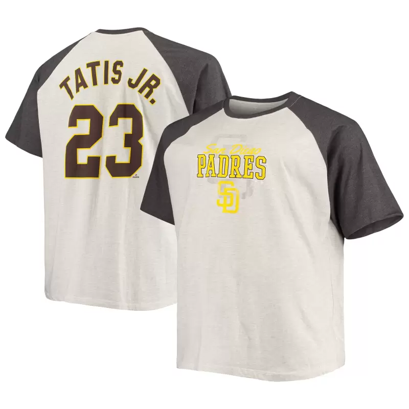 Men’s San Diego Padres Fernando Tatis Jr. Oatmeal/Heathered Charcoal Big & Tall Name & Number Raglan T-Shirt