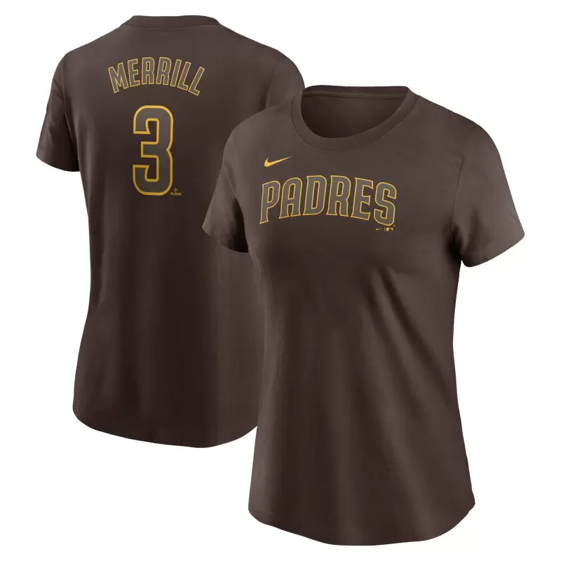 Women’s San Diego Padres Jackson Merrill Nike Brown Cooperstown Collection Fuse Name & Number T-Shirt