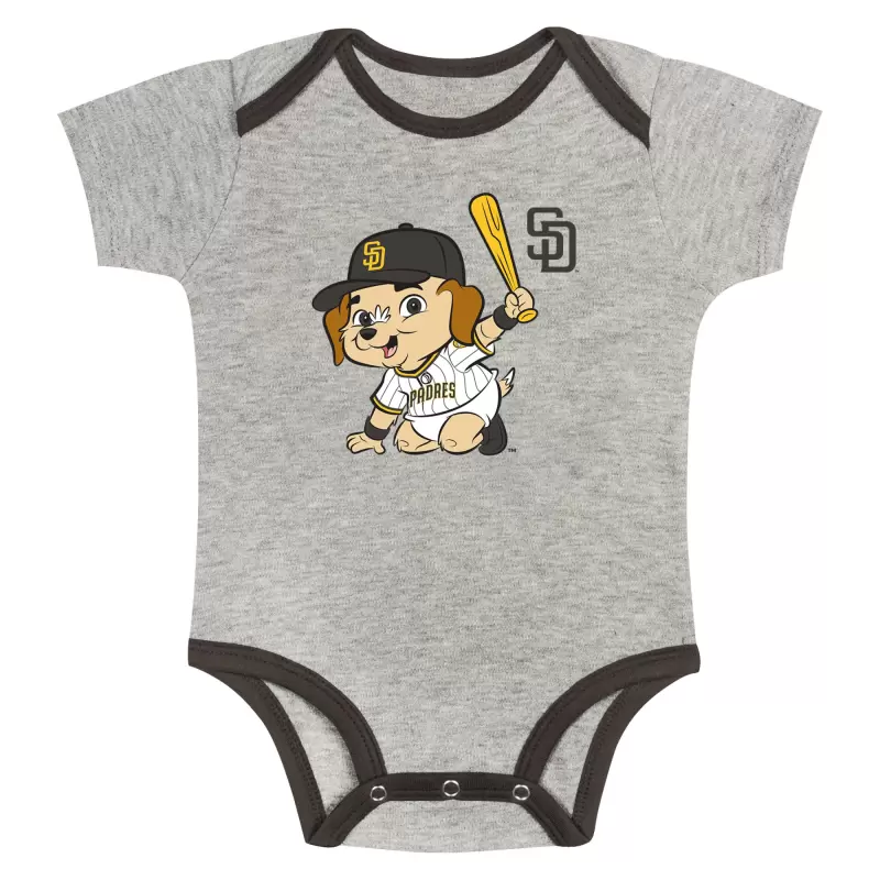 Start nurturing a love for the San Diego Padres with these Play Ball bodysuits. This two-pack set features the San Diego Padres logo, “Baseball” in a repeating design and the team mascot as an adorable baby. A lap shoulder neckline and snaps help make dressing easier.