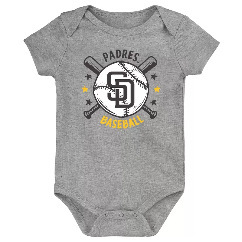 Give your littlest fan the gift of San Diego Padres spirit with this adorable Batter Up 3-Pack Bodysuit Set. The set includes three adorable bodysuits, each featuring eye-catching San Diego Padres graphics that will have them ready to root for the home team. With a lap shoulder neckline and three-snap closure, changing your little fan will be a breeze.