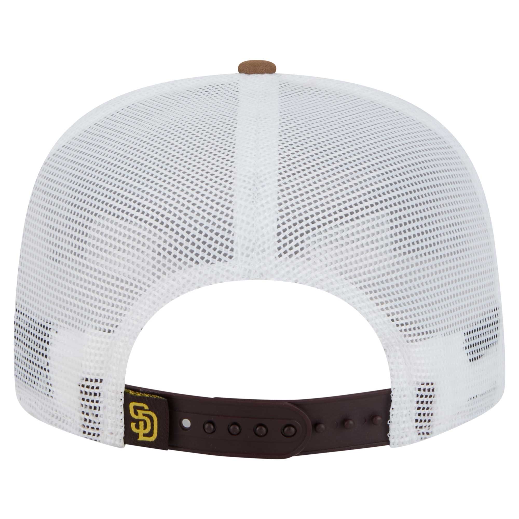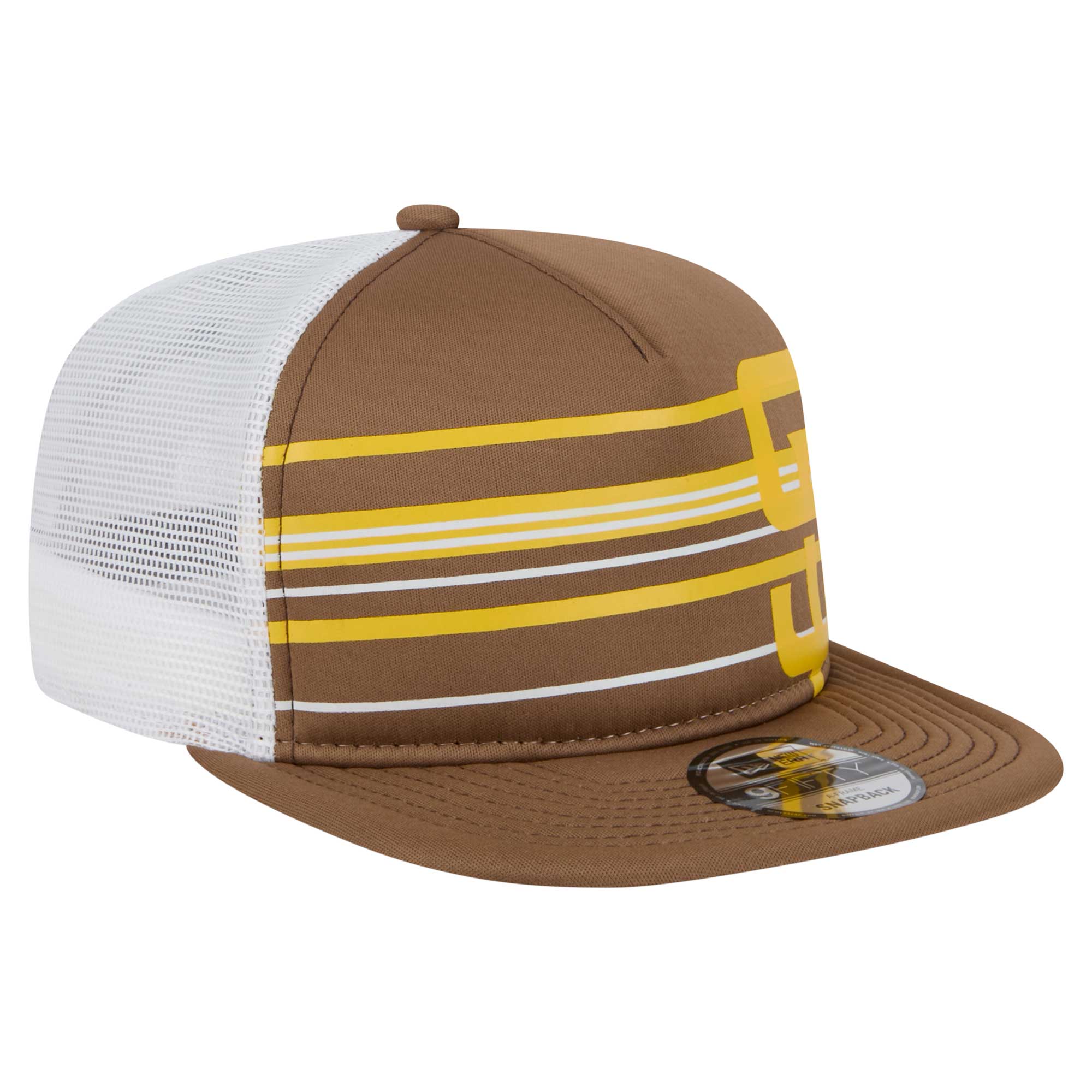Show off your San Diego Padres pride with this New Era 9FIFTY A-Frame Trucker Snapback Hat. It features a classic snapback style with a high-profile pinched crown and single-panel front, providing a timeless and stylish look. With a solid front panel and mesh mid and rear panels, this San Diego Padres hat offers breathability and comfort, making it perfect for all-day wear.