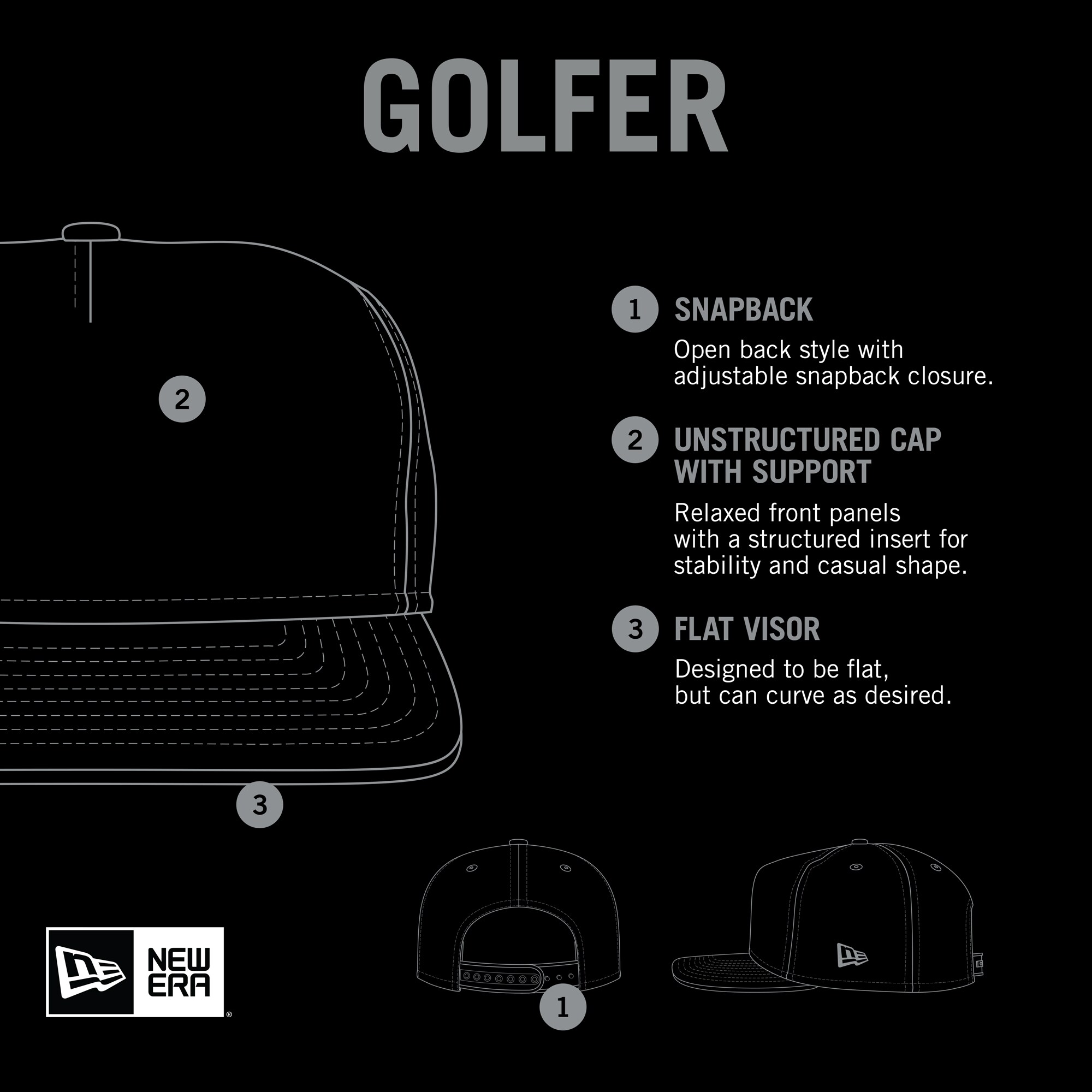 - The Golfer is a semi-structured cap, with a pinched crown and flat visor which gives a retro look and shape like snapbacks from the ’80s and ’90s