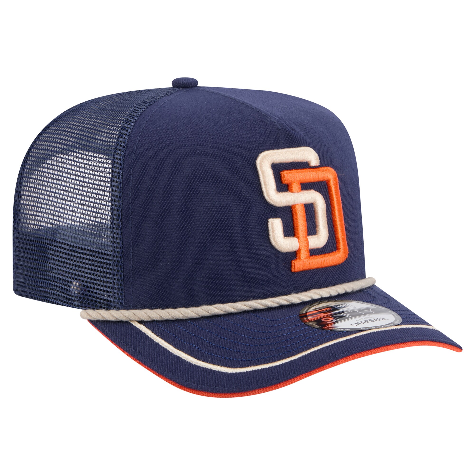 Top your game day look off with the perfect accessory in the form of this San Diego Padres Vintage Rope Trucker A-Frame 9FIFTY Adjustable Hat from New Era. This San Diego Padres hat features an embroidered team graphic with raised details on the solid front panels and a rope decoration that draws the eye to the front of the cap. The four mesh mid and rear panels provide added breathability, ensuring you stay cool and comfortable whether you’re at the game or out and about.