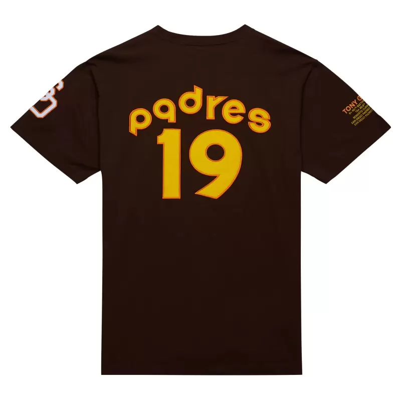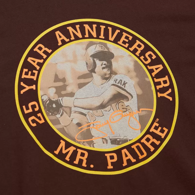 Tony Gwynn’s exceptional talent as one of the best pure hitters ever earned him many accolades over a legendary career, including being named an eight-time National League batting champion, a Silver Slugger Award winner seven times, winning five Gold Gloves and being a 15-time All-Star. Honor the beloved San Diego Padres icon and one of the most respected players in baseball history with this Cooperstown Collection Legends Photo Real T-shirt. Its vintage design from Mitchell & Ness features his faux signature on an action shot of the 2007 Hall of Famer encircled by the words 25 Year Anniversary Mr. Padre, a throwback team logo embroidered on the left sleeve, some of Gwynn’s career accomplishments printed on the right sleeve and his San Diego Padres uniform details embroidered on the back.