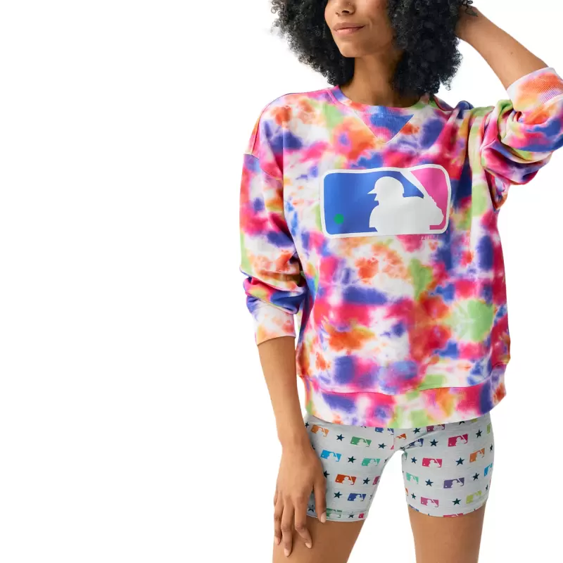 ustrate your devotion to Major League Baseball by grabbing this Batterman Neon sweatshirt. It features a bright tie-dye pattern all over with the iconic MLB Batterman logo at the center. This stylish sweatshirt hits right at the waist and will enhance your ensemble whether you’re at the ballpark or you’re around town.