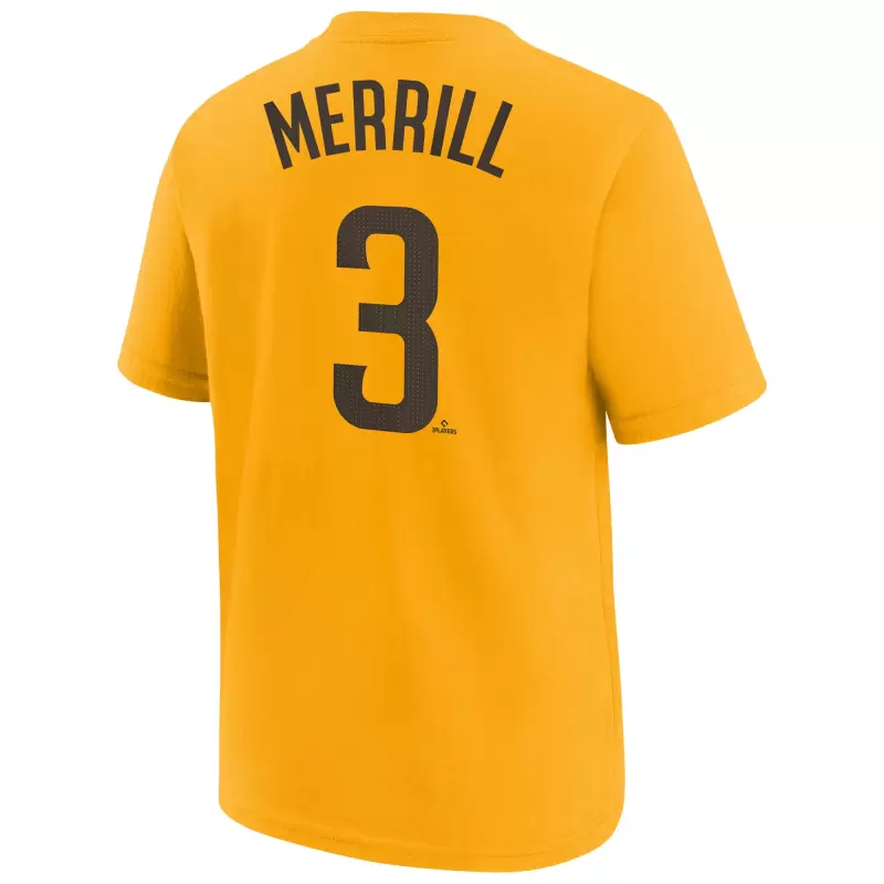 Your youngster is looking for an awesome tee to wear whenever they go to the ballpark. You can help them do just that by getting this Jackson Merrill San Diego Padres Player Name & Number T-Shirt from Nike. With distinct San Diego Padres and Jackson Merrill graphics on the front and back, your kiddo will be able to showcase their fierce devotion to the team.